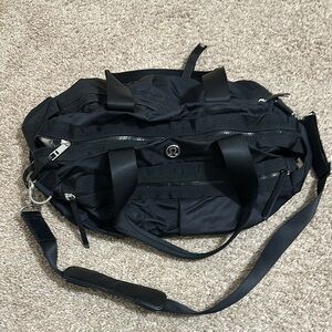 Stylish travel bag with vibrant pink handles and accents. Soft purple body. Perfect for on-the-go.