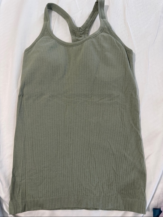 Ribbed knit racerback tank with a scoop neckline. Stretchy, form-fitting silhouette. Breathable fabric ideal for layering or solo wear.