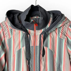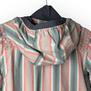 Stylish lululemon jacket with vibrant stripes. Features a hood and zip closure. Perfect for casual wear.