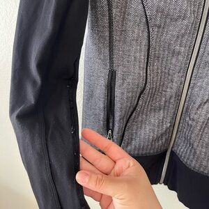 Chic zip-up sweater with a charcoal body. Black sleeves and accents. Ideal for layering. The jacket is in good shape, some slight sign of wear, does not have sizing but it is a size 6.
