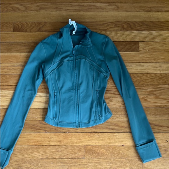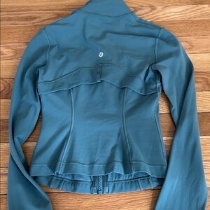 Blue/green define jacket. In excellent condition. Features a zip-up front and long sleeves.