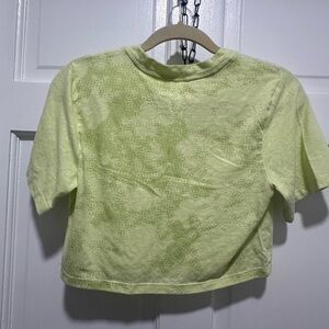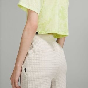 Elevate your casual style with this yellow crop t-shirt from Lululemon Athletica. Featuring a relaxed fit and short sleeves, this top offers a comfortable and breezy feel. Its cropped design and soft fabric make it a perfect choice for warm weather days.