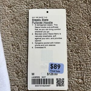 Used lululemon white steady state hoodie in size medium. Only worn 3 times. Used lightly with no stains. Has original size tag and comes with hang tag. See pictures for details. Bundle and save with other lululemon items!