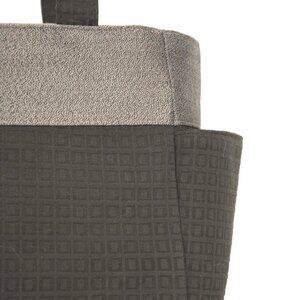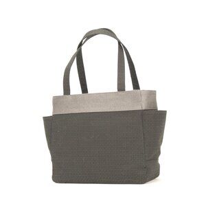 Small, black tote with grey tone top, 2 main sections + laptop pocket and internal zip pocket, 2 easy access external side pockets. Jacquard, wipeable material. Measures 13"L, 6"W, 11.5"H