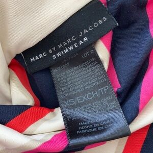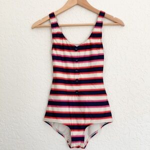 mac by marc jacobs swimwear navy striped one piece swimsuit. Has fake button details.