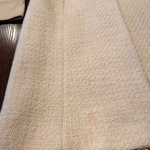 used in good condition high quality mackage brand women textured wool coat with leather trim on the sleeve, shoulders and a belt with a small stain on the bottom side of the coat that can be removed its not visible.