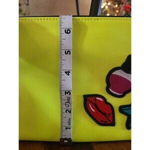 Fun makeup bag in neon yellow/green. Appliques make this one fun- perfume, lips and star embroidered. Back and interior are black and
