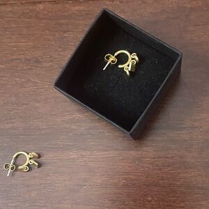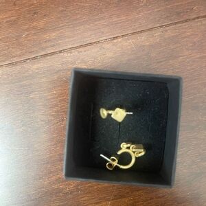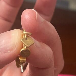 very hard to photograph. I believe this color is vintage gold, and each hoop has a circle square and another circle charm hanging from it.