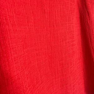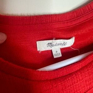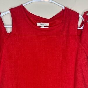 madewell red cold shoulder short sleeve crewneck blouse. good used condition. no holes or stains. smoke free. underarm to underarm approx 19. loose flowy fit. dress up or down. tie sleeves