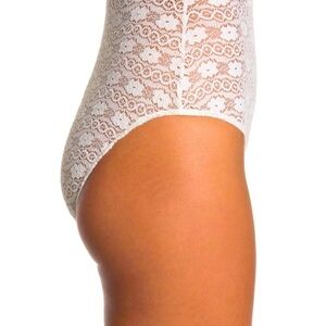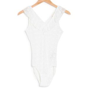 Made entirely from delicate white lace, this bodysuit with straps features a shirred ruffle right along the neckline. It can be worn as a sensual top with tailored trousers for a glam, very 80s look.