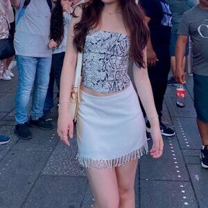 majorelle aurora mini skirt in white with an embellished crystal/rhinestone fringe