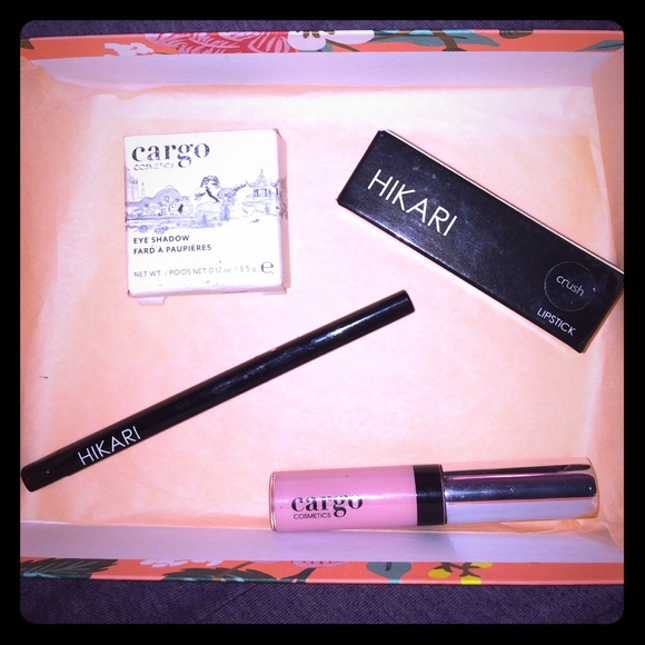 Cargo eyeshadow in 'Green Bay' (10$), Hikari lipstick never used!!! in 'Crush' ($15), Hikari eyeliner in 'silver' ($4), Cargo lipgloss in 'anguilla' for ($5)
