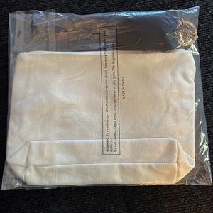 White canvas makeup bag with, Hello Beautiful, writing. Black pompon and other designs. Zipper works perfect. Never used.