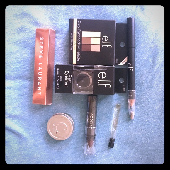 bundle of 7 products; elf clay eyeshadow palette in "necessary nudes", elf cream eyeliner in "black", elf eyebrow lifter and filler in "dark", model co lip crayon in "red velvet", cargo bronzer, steve laurant lip gloss, and mini guess dare perfume