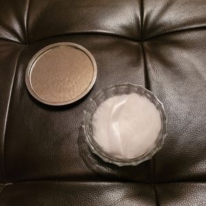 there is a small chip at the edge of the mirror (pictured). mirror is securely in, but wasn't glued in or it dried up and lost attachment to lid. unused. displayed on extra vanity.