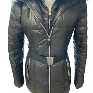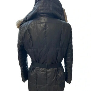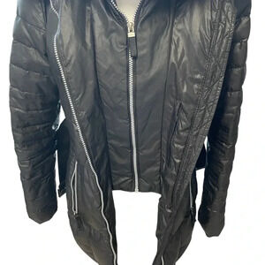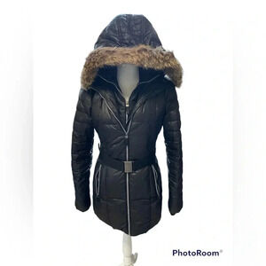 Marc New York Real Coyote Fur Black Coat. Size medium. Has belt buckle closure removable hood. Has extra zip layer inside. Perfect for winter days. Has a rip on arm put (picture provided, price reflects) purchased at Bloomingdale’s for $300.