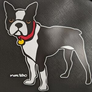 EXTERIOR: Synthetic (PVC) Saffiano. Top zip closure. Polished silver tone hardware. Large Boston Terrier print on one side. Small marc tetro logo print on opposite side.