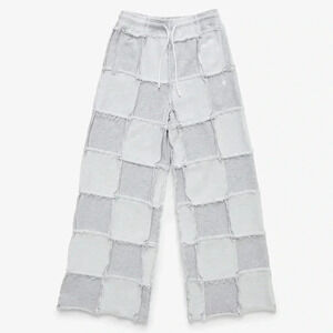 Grey checkered sweatpants featuring inside-out effect. White cross logo embroidered at front. Two side pockets, elasticated waistband.