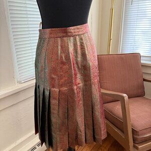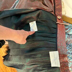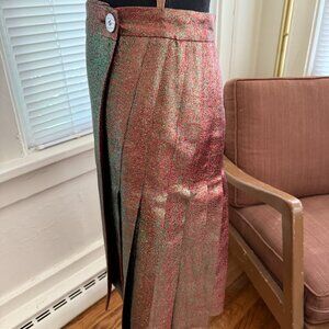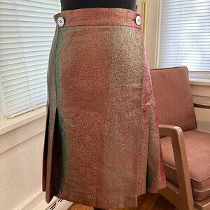 love this skirt but too small, love shimmer in the winter. no sog wear or issues, good condition but vintage, some areas have very slight snagging but no major damage just the quality of fabric, no stretch. runs small, size 40, poly metallic mix, waist roughly 13, length 24, slighly above or below knee on most