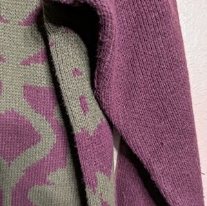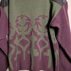 Stylish sweater featuring green and purple patterns with leather shoulder accents. Perfect for a unique and cozy look.