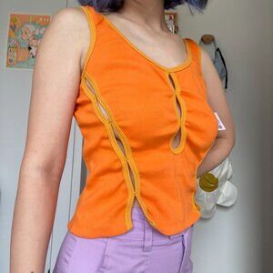 - this tank features cutouts down the front and sides and is made of medium weight rib knit