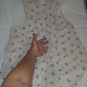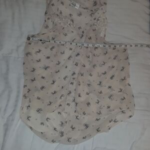Mary Jane USA sheer bowtie patterned boluttons up top. The size tag is worn off so I took measurements. Pit to pit is 20 inches and the length is 24 inches. This shirt is really hard to photograph and probably should be modeled. There are fun lace details on the shoulder and the back is open. Super cute!!! There is a slight discoloration on the bottom right side of the shirt but it is hardly noticeable.