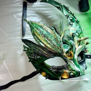 Hand painted over leather with with silver, gold studs. Features leaf like appliqué as well as gems & stone. Inside comfortable fitting felt lining. One size fits all w/lace ties to fit around the circumference of your head. Great for Masquerade parties, Mardi Gras or as an art piece to hang on the wall as decor. Handmade one of a kind finished with glossy glass like sheen. Made by me from a black shell mask. I also make custom jewelry and clothes pls send request to irinavstyling@gmail.com