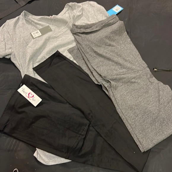 brand new with tags, gray T-shirt, and two pairs of leggings over the belly style