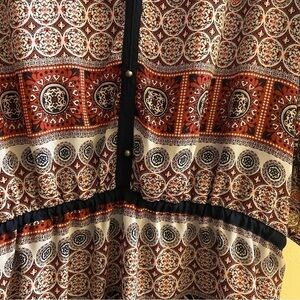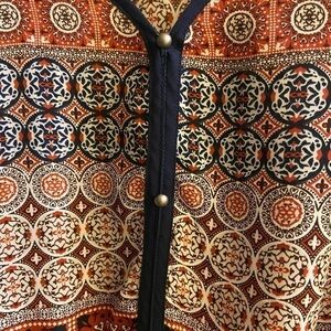 Vneck with elastic waist and elastic sleeve ends. Excellent condition with no stains or defects. Navy blue trim with brown and burgundy