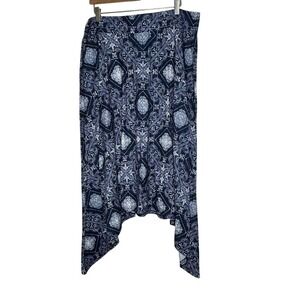 Keywords: maurices skirt, handkerchief skirt, diamond print skirt, flowy skirt, plus size skirt, asymmetrical hem skirt, bohemian skirt, womens skirt, elastic waist skirt, casual skirt, blue and white skirt