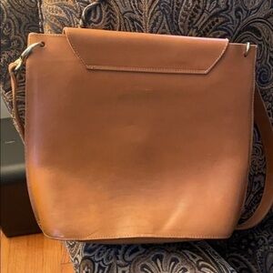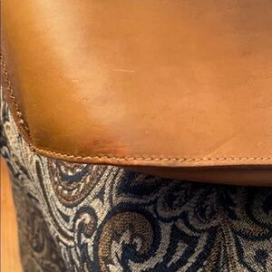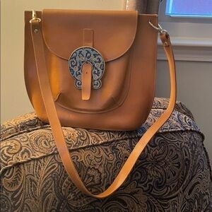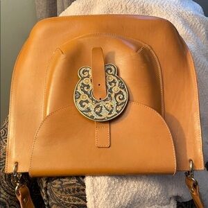 Unique and beautifully made large crossbody. I added a vintage enamel belt buckle for a little something something. I thought this made a great addition to a great piece to start with. See the pictures - in excellent condition aside for some blemishes and a pen mark! Made in Italy!!! Carmel color