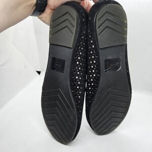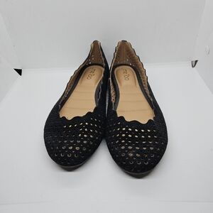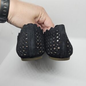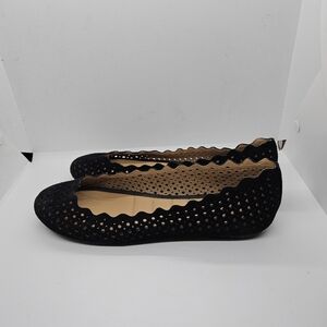 Black suede flats with scalloped edges and perforation for a mesh-like appearance. In very good used condition.