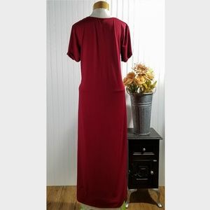 Perfect maxi dress for fall and winter! A beautiful shade of cranberry red, and comfortable as could be! A loose fitting tee shirt style maxi that basically a blank canvas to style yourself on. Item is used, but is still in great shape with lots of life left to give.