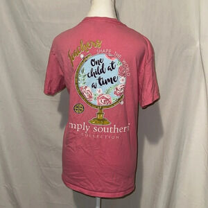medium Simply Southern "teachers shape the world one child at a time" graphic tshirt. Pink with floral globe