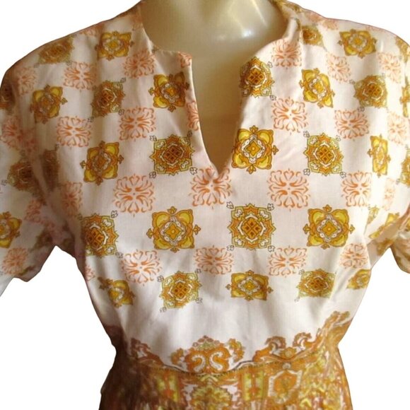 medium Vintage Dress 1960s Boho Floral Print Short Sleeve Dress Golden Print