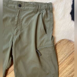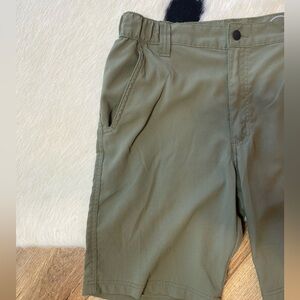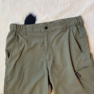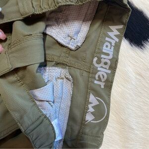men's olive green Wrangler cargo or utility shorts, likely designed for comfort and versatility in outdoor or casual settings.