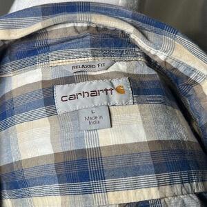 men’s blue white brown cream/tan plaid relaxed fit short sleeve Carhartt button down shirt size large