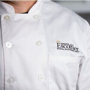 Elevate your culinary attire with the Escoffier Jacket, a signature piece for chefs and culinary professionals. Crafted with 65% Polyester/35% Cotton blend, this 7.0 oz.wt. jacket features a full cut with a mitered breast pocket, 8-button placket, and long sleeves for maximum coverage. The double row of buttons not only adds style but serves to protect against hot liquids and spills. Designed with functionality in mind. Size M