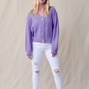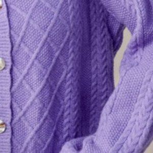 Features: Long balloon sleeves, cable-knit, scalloped trim, dropped shoulders, button front