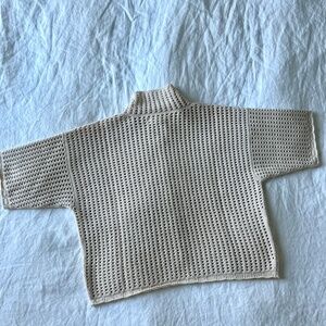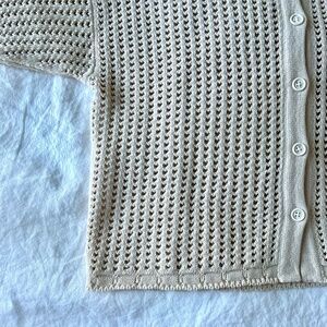 Open knit cotton short sleeve cardigan with relaxed fit. Petite scallop hem detail at bottom hem and sleeve. Button front. A super versatile spring piece.