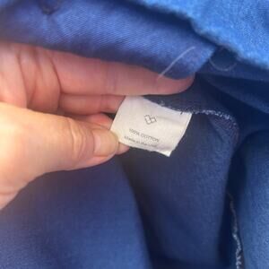 easy and sweet with a light denim feel / full button front / tie detail in front / dolman cut sleeves / excellent preowned condition