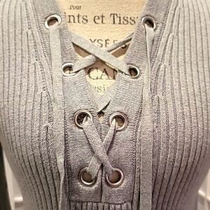 Ribbed design to accentuate your girlie figure with silver eyelet lace ups trimmed in heavy duty metal tassle hardware. Only worn a few times. 3/4 length sleeves. Xs but I wear a medium and this fit well.