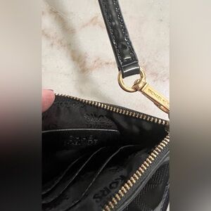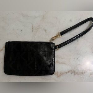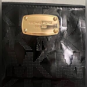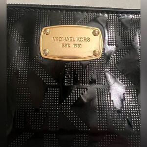 This Michael Kors clutch, crafted from glossy black patent leather, features a sleek and minimalist design. The gold-tone metal logo on the front adds a touch of elegance, making it perfect for both casual and dressy occasions. Its compact size is ideal for carrying essentials like a lipstick and cards.