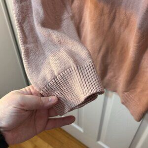 Stylish peach sweater with a geometric design. Features a cozy high neckline. Perfect for cool weather.
