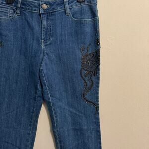 description: gorgeous vintage-style embroidered denim with beaded detailing on both thighs. medium wash, straight-leg fit, super flattering + unique. perfect y2k/boho statement jeans.