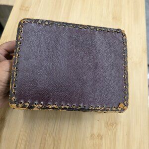 The product is a small rectangular trinket box made of brown leather, featuring an embossed design. Handmade by Miguel de Cervantes in Spain, the vintage piece is a unique decorative collectible. With its intricate craftsmanship and antique appeal, this trinket box would make a charming addition to any collection or art-themed department.