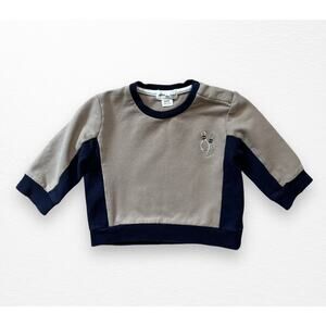 French terry colorblock sweatshirt from miles the label in size 6 months. Khaki with navy panels, snaps at shoulder, and embroidered bowling pins on chest. Super soft and adorably retro. 95% organic cotton/5% elastane.