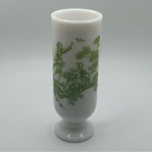 Very good vintage condition. vintage Avon milk glass demitasse cup with a green toile Victorian scene. These cups were sold by Avon, likely in the 1970s. Made of white milk glass and features a green toile design depicting a Victorian scene, often showing a man and woman with greenery or farm animals.