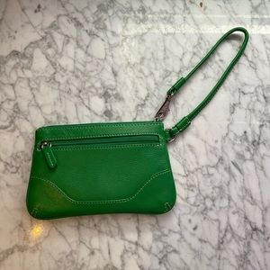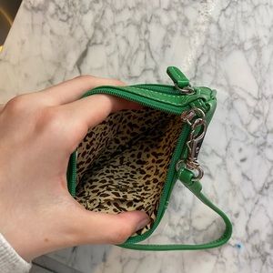 mini handbag with green leather and cheetah print interior much room for cards and cash and coins perfect for a little handbag when going out