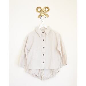 This breezy two-piece set from Mini Marley features a lightweight long-sleeve button-down top and matching shorts in soft cream and tan stripes. With its relaxed fit and natural tones, it’s perfect for warm days, beach outings, or dressing up with effortless ease.
